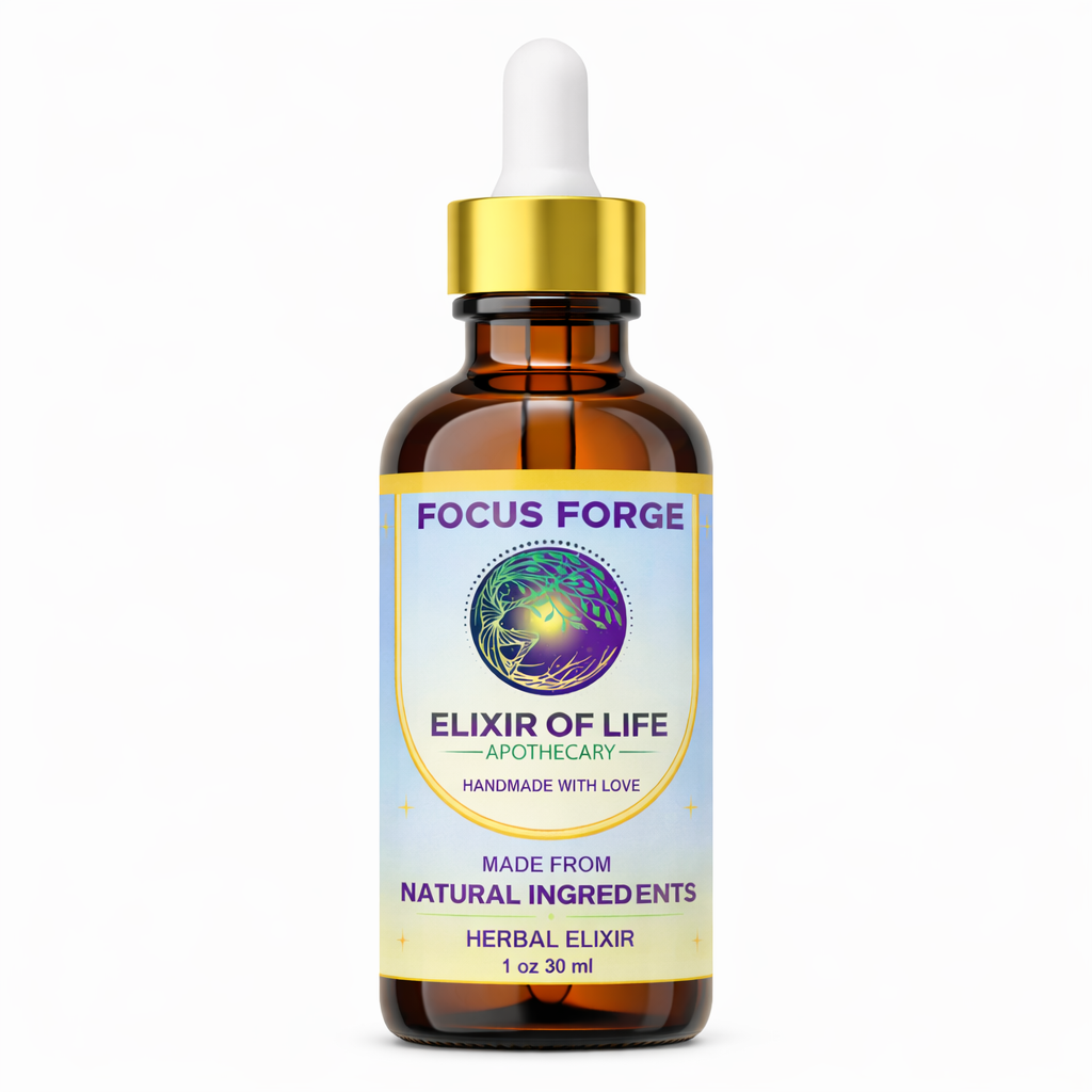 Focus Forge is a thoughtfully formulated herbal tincture designed to support mental clarity, sustained focus, and cognitive resilience—without overstimulation or burnout. Crafted for modern minds navigating constant input, this blend supports brain function, stress balance, and long-term mental stamina.